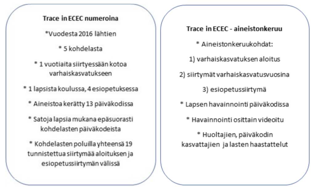 Trace in ECEC – tutkimushankkeessa seurataan lasten siirtymiä varhaiskasvatuksen aloituksesta aina esiopetukseen asti. Tämä pitkäkestoinen aineistonkeruu tuottaa tietoa siitä, minkälaisia sosiaalisia, fyysisiä ja filosofisia muutoksia ja jatkuvuuksia lapset ovat kohdanneet varhaiskasvatuspoluillaan (Ackesjö 2014; Harju ym. 2022 arvioinnissa). Yaiza Lucas Revillan väitöstutkimus keskittyy pienten lasten suhteisiin varhaiskasvatuksen aloituksessa (Lucas Revilla ym. 2022). Kaisa Harjun väitöstutkimus pureutuu varhaiskasvatusvuosien aikana tapahtuviin siirtymiin, joista on vielä hyvin vähän tutkittua tietoa (Harju ym. 2022 arvioinnissa). Näitä siirtymiä ovat muassa ryhmästä toiseen vaihdot saman talon sisällä. Jasemin Canin väitöstutkimus keskittyy lasten siirtymäresursseihin esiopetussiirtymässä (Can ym. 2022 arvioinnissa). Lisäksi olemme tarkastelleet siirtymiä muun muassa tuen tarpeiden (Rutanen ym. 2022b) ja vanhempien luottamuksen (Rutanen & Laaksonen 2020) ja tunteiden ja odotusten näkökulmasta (White ym. 2020) sekä lapsia koskevan tutkimuksen eettisiä kysymyksiä erityisesti tiimissä tehtävässä tutkimuksessa ja kansainvälisessä yhteistyössä (Rutanen ym. 2018; 2021).